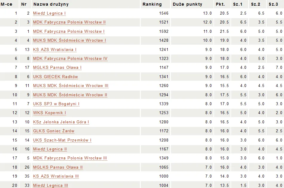 Niestety nie obroniliśmy zdobytego w poprzednim roku tytułu Drużynowego Mistrza Dolnego Śląska Juniorów w Szachach Szybkich. Nasze drużyny zdobyły srebro i brąz, a złoto powędrowało do ekipy z Legnicy. Z czterech naszych drużyn najlepszy wynik osiągnęła MDK Fabryczna Polonia Wrocław II (Dytman, Demski, Janicki, A.Krzyżosiak), która z 12 pkt (6 zwycięstw, 1 porażka) zdobyła srebrny medal. Trzecie miejsce z bilansem 11 pkt (5 zwycięstw, 1 remis, 1 porażka) wywalczyła ekipa MDK Fabryczna Polonia Wrocław I (Luberański, Madej, Grobelny, M.Krzyżosiak). Miejsce w pierwszej „10” udało się zdobyć MDK Fabryczna Polonia Wrocław IV (Topoła, P.Madajczak, Nakielna, Jędrzejko), która z 9 pkt (4 zwycięstwa, 1 remis, 2 porażki) uplasowała się na 6. pozycji. Najgorszy rezultat z naszych ekip osiągnęła MDK Fabryczna Polonia Wrocław III (J.Madajczak, Starościak, F.Kosior, Janikowska) ze zdobyczą 8 pkt (3 zwycięstwa, 2 remisy, 2 porażki) ukończyła na 17. miejscu.