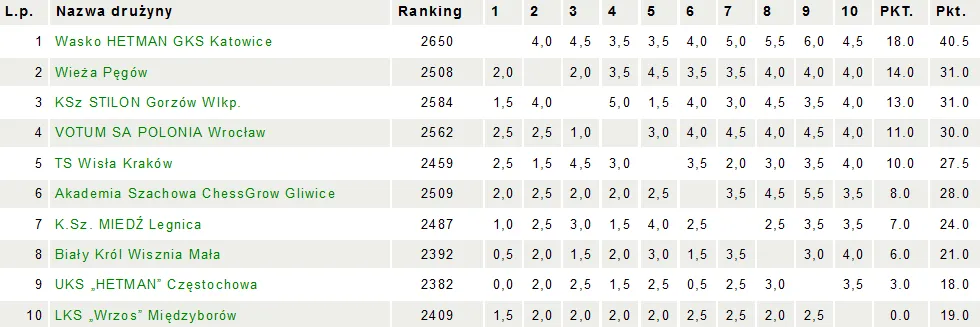 W ostatniej rundzie czekał nas bardzo trudny pojedynek z ekipą Wasko HETMAN Katowice, który koniecznie musieliśmy wygrać, aby myśleć o medalu. Niestety, tradycyjnie już, przegraliśmy z drużyną z Katowic, z którą przegrywamy regularnie od 2008 roku 🙁 Porażka 2,5-3,5 oznaczała dla VOTUM SA Polonii Wrocław zajęcie 4. miejsca, które to miejsce jest najgorszym wynikiem Polonii od 2012 roku, kiedy też zajęliśmy 4. miejsce. Dla Polonii zapunktowali: Daniel Sadzikowski (wygrana), zremisowali Mateusz Bartel, Dimitrios Mastrovasilis, Marcin Tazbir, przegrali Oskar Wieczorek oraz Jolanta Zawadzka. Tytuł mistrzowski obroniła drużyna z Katowic, srebro przypadło beniaminkowi Wieży Pęgów, brąz trafił do Stilonu Gorzów Wlkp. Gratulacje dla medalistów Do I Ligi spadły Wrzos Międzyborów i Hetman Częstochowa.