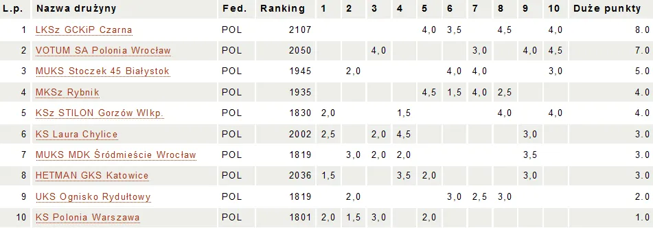 Kojarzenia 5. rundy: MUKS MDK Śródmieście Wrocław – KS Polonia Warszawa, KS Laura Chylice – VOTUM SA Polonia Wrocław, HETMAN GKS Katowice – MUKS Stoczek 45 Białystok, KSz Stilon Gorzów Wlkp. – UKS Ognisko Rydułtowy, LKSz GCKiP Czarna – MKSz Rybnik