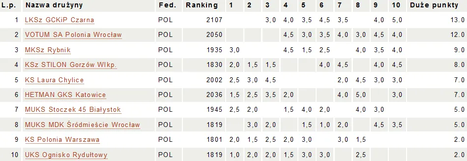 Metę widać już coraz wyraźniej! W kolejnym pojedynku podczas Ekstraligi Juniorów, pokonujemy 4,5-1,5 KSz Stilon Gorzów Wlkp.! W miniaturce swoje partie dla VOTUM SA Polonia Wrocław wygrali Szymon Gumularz oraz Magdalena Pawicka 🙂 Kolejne zwycięstwa dołożyli Maciej Czopor i Jakub Luberański. Remis dołożył Marek Madej i już mieliśmy kolejne 2 pkt w kieszeni 🙂 Niestety przegrała Magdalena Harazińska 🙁 Dla polonistów było to piąte zwycięstwo (przy jeszcze dwóch remisach) i ze stratą 1 pkt do lidera zajmujemy 2. miejsce. Jutro przed nami kluczowy pojedynek, jeżeli myślimy o złotym medalu. Za przeciwników będziemy mieli liderów tabeli, ekipę LKSz GCKiP Czarna!