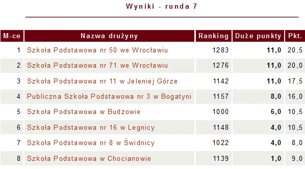 - 6. miejsce SP 16 w Legnicy – Fiedorek Michał (pierwsza szachownica) 6,5 pkt z 7.