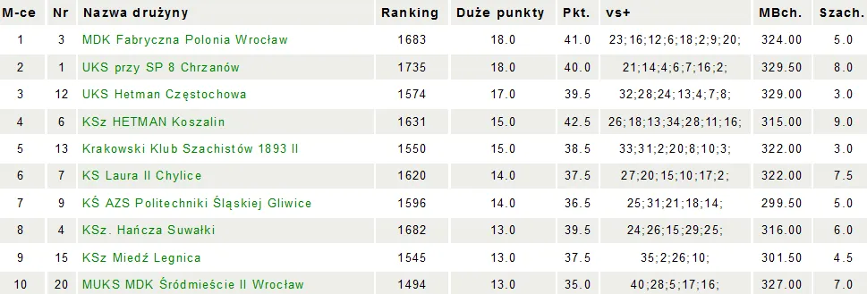 Wspaniała ostatnia runda II Ligi Juniorów w wykonaniu MDK Fabryczna Polonia Wrocław II! W derbowym pojedynku przeciwko MUKS MDK Śródmieście II Wrocław, odnosimy pewne zwycięstwo 4,5-1,5! Zwycięstwo, w meczu z rywalem „zza miedzy”, przypieczętowało awans naszej drugiej drużyny do przyszłorocznej I Ligi Juniorów (drugi szczebel rozgrywkowy)! Co więcej, po remisie dotychczasowego lidera, zrównaliśmy się punktami z ekipą z Chrzanowa, ale to MDK Fabryczna Polonia Wrocław zajmuje 1. miejsce (na 40 startujących drużyn), ponieważ mamy lepsze małe punkty (suma punktów zdobytych przez zawodników drużyny). W ostatnim meczu ligi, punkty zdobyli: Jakub Madajczak, Piotr Madajczak, Kacper Karp, Marta Krzyżosiak (wszyscy zwycięstwa), zremisował Adam Kawałko, przegrała Martyna Jędrzejko. WIELKIE GRATULACJE! Lipiec jest zdecydowanie udany dla naszych juniorskich drużyn 🙂 Przypomnijmy, że ponad trzy tygodnie temu, nasza pierwsza drużyna wywalczyła wicemistrzostwo kraju!