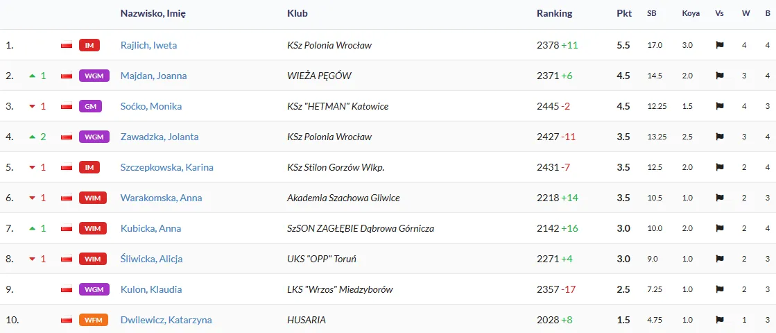 Na dwie rundy przed końcem MOKATE Indywidualnych Mistrzostwach Polski Kobiet Iweta Rajlich z 5,5 pkt zajmuje 1. miejsce, Jolanta Zawadzka z 3,5 pkt dzieli miejsca 4-6, tracąc 1 pkt do miejsc 2-3. Jutro ważna runda dla Iwety ponieważ zagra z Moniką Soćko. W LOTTO Indywidualnych Mistrzostwach Polski z polonistów największy dorobek punktowy ma na swoim koncie Mateusz Bartel – 4 pkt, 3. miejsce, Szymon Gumularz po porażce z Mateuszem z dorobkiem 3,5 pkt dzieli miejsca 5-7, Daniel Sadzikowski z 2,5 pkt plasuje się na 9. miejscu.