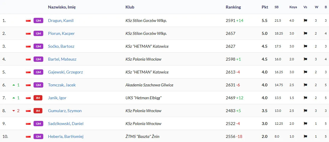 Wśród Panów także mamy szanse medalowe. Z Bartoszem Soćko zremisował Mateusz Bartel, który z 4,5 pkt dzieli miejsca 3-4. Mateusz, mógł jednak osiągnąć lepszy wynik, kiedy to w końcówce dostał nieoczekiwaną szanse na wygraną (partia poniżej, po 54.Wd2 polonista mógł zagrać 54… Kf5). Jednakże, nasz zawodnik nie wykorzystał szansy i jutro o medal będzie walczył z Kacprem Piorunem. Niestety, z Igorem Janikiem przegrał Szymon Gumularz (druga porażka z rzędu) i nadal na swoim koncie ma 3,5 pkt (8. miejsce miejsce). Zremisował Daniel Sadzikowski (z Kacprem Piorunem) i z 3 pkt zajmuje 9. miejsce.