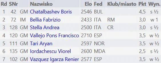 Daniel na pierwszej szachownicy zdobył 4 pkt z 7 (zwycięstwo, 6 remisów) i zyskał na rankingu 6,7 pkt ELO. Poniżej wynik indywidualny polonisty:
