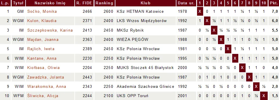 W zmaganiach kobiet szansę na miejsce na podium miała Iweta Rajlich, ale przegrała w ostatniej rundzie z Klaudią Kulon (6 pkt.) i to rywalka wywalczyło srebro. Złoto zdobyła broniąca tytułu Monika Soćko (7 pkt.), brąz Karina Szczepkowska (5,5 pkt.), a Iweta (5 pkt.) zajęła 5.miejsce. W ostatniej rundzie o medale nie walczyły już dwie kolejne reprezentantki Polonii, ale zarówno Jola Zawadzka, jak i Ania Kantane na pożegnanie z turniejem wygrały swoje partie. Ania (5 pkt.) zakończyła zmagania na 6. pozycji, a Jola (4 pkt.) na 8.