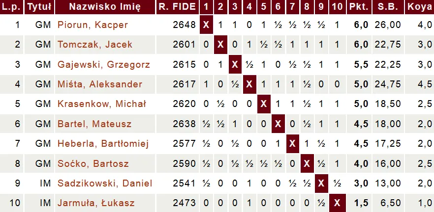W rywalizacji mężczyzn zwyciężył Kacper Piorun, który w ostatniej rundzie zremisował z naszym Danielem Sadzikowskim. Przypomnijmy, że świeżo upieczony mistrz Polski rozpoczął turniej od remisu z drugim naszym zawodnikiem Mateuszem Bartlem. W ostatniej rundzie Mateusz pokonał Łukasza Jarmułę i z dorobkiem 4,5 pkt. zakończył turniej na 6. pozycji. Daniel wywalczył w sumie 3 punkty i zajął 9. miejsce.