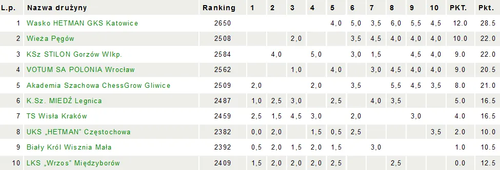 Przed nami ostatni etap walki o Drużynowe Mistrzostwo Polski – Ekstraliga 2018! Najlepsze 10 klubowych drużyn w Polsce, rozegra w Katowicach ostatnie trzy rundy w najwyższej klasie rozgrywkowej w Polsce w tym roku! Nasza ekipa – VOTUM SA Polonia Wrocław, po 6. rundach z dorobkiem 9 pkt dzieli miejsca 3-4. Za przeciwników podczas ostatniego zjazdu będziemy mieli dwie drużyny z naszego województwa, czyli Wieże Pęgów oraz Miedź Legnicę. Wisienką na torcie, będzie bój w ostatniej rundzie przeciwko aktualnemu Mistrzowi Polski Wasko HETMAN GKS Katowice! Rundy w piątek i sobotę rozpoczynają się o godz. 15:00. Niedzielna, ostatnia runda, zostanie rozegrana o godz. 10:00. Trzymamy kciuki za polonistów!
