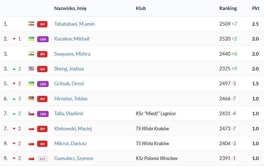 Turniej w Krakowie rozgrywany jest na dystansie 9 rund (każdy z każdym), granych tempem 90 minut + 30 sekund na posunięcie na zawodnika. Uczestnicy „kołówki” rozegrali już 3 rundy w których nasz zawodnik – Szymon Gumularz, zdobył 1 pkt. Polonista przegrał dwie partie, z Kazkovem Mihailem (2520) oraz Tabatabaei M.amin (2509) oraz wygrał z Hirneise Tobiasem (2466).
